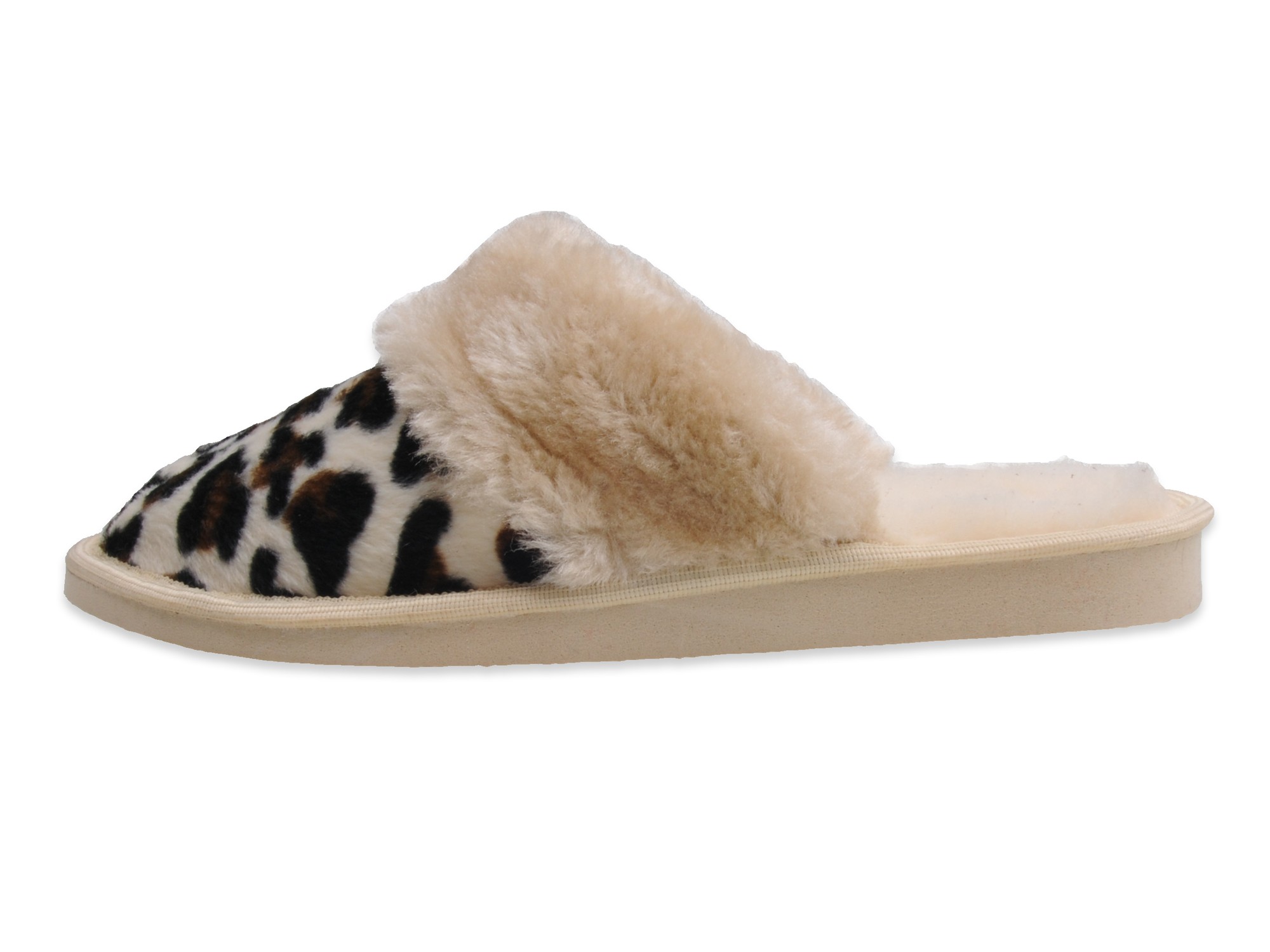 Ocieplane kapcie domowe wykonane z futerka imitującego panterkę. Wkładka oraz wyściółka wykonana jest z wysokogatunkowego runa owczego. Runo wełniane gwarantuje komfort termiczny w chłodne zimowe wieczory. Użyte do ocieplenia kapci w odróżnieniu od tradycyjnej wełny jest miłe w dotyku i „nie gryzie”. Podeszwa wykonana z antypoślizgowej gumy. Solidne i estetyczne wykończenie gwarantuje wysoką jakość tego produktu. Podwyższony klin amortyzuje stopę podczas chodzenia. Antypoślizgowa podeszwa wykonana została z wysokiej jakości materiałów, dzięki czemu jest trwała (odporna na ścieranie) i nie rysuje powierzchni. Pantofle są cieplutkie i przyjemne w dotyku. Wysokość obcasa około 2 cm. Wyprodukowane w Polsce.